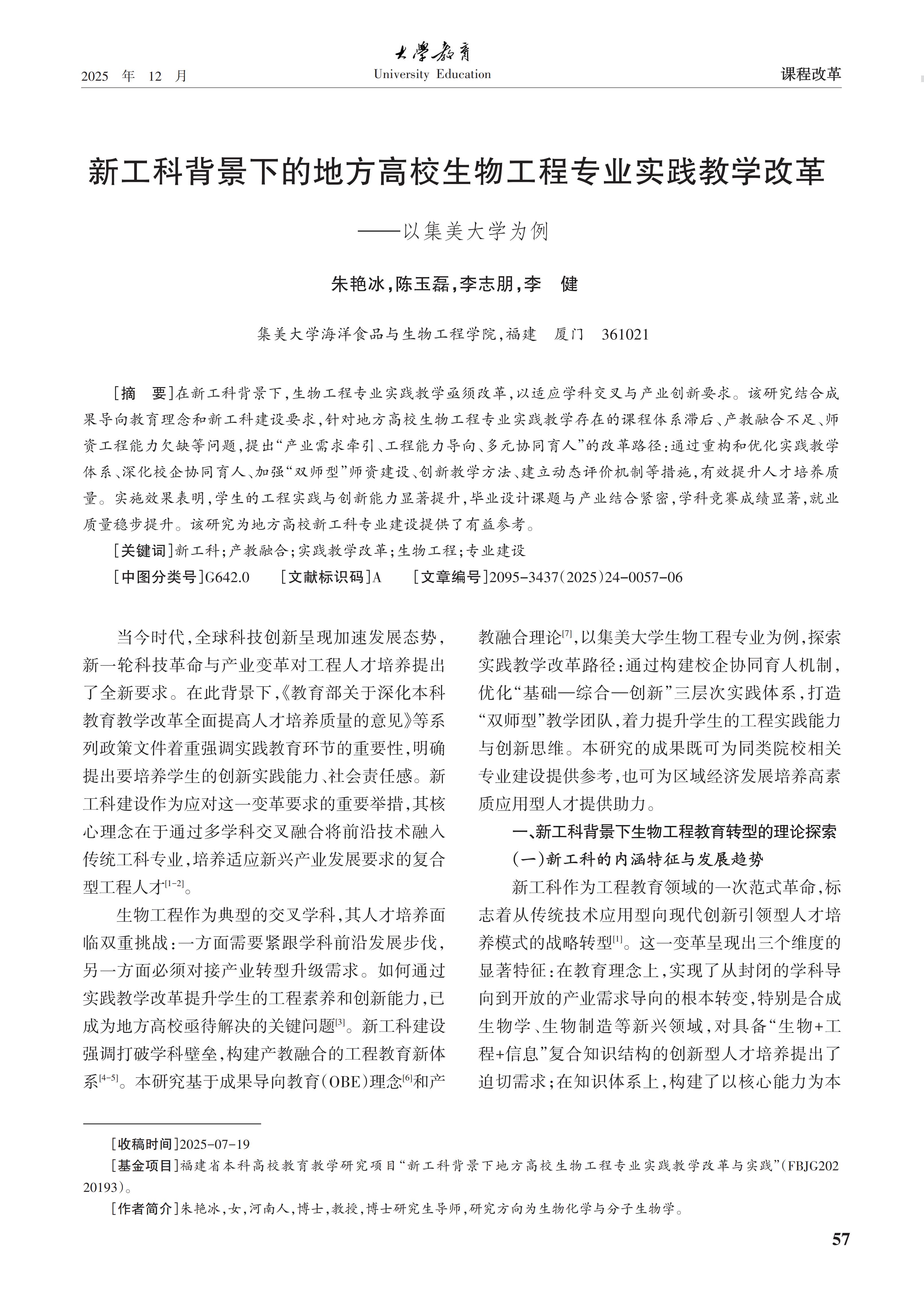 [2025-25]新工科背景下的地方高校生物工程专业实践教学改革——以集美大学为例